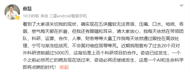 蔡磊深夜发文:现在五体瘫软无法言语,但我还有眼睛和耳朵