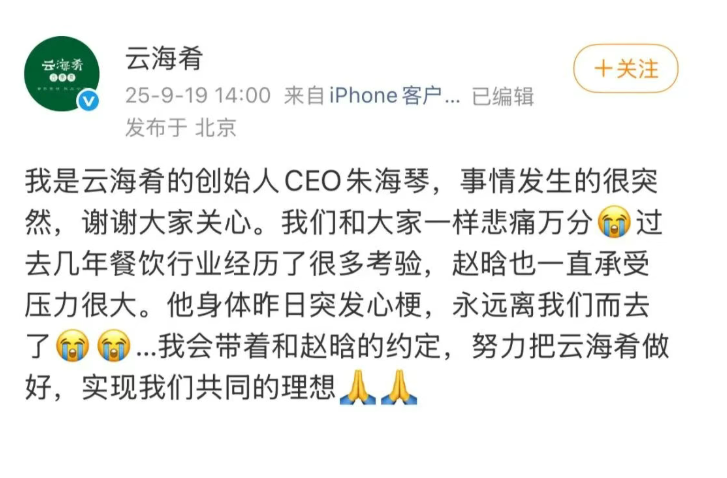 19日下午,云海肴官方微博发文:“我是云海肴的创始人CEO朱海琴,事情发生的很突然,谢谢大家关心。我们和大家一样悲痛万分,过去几年餐饮行业经历了很多考验,赵晗也一直承受压力很大。他身体昨日突发心梗,永远离我们而去了…...我会带着和赵晗的约定,努力把云海肴做好,实现我们共同的理想。 ”