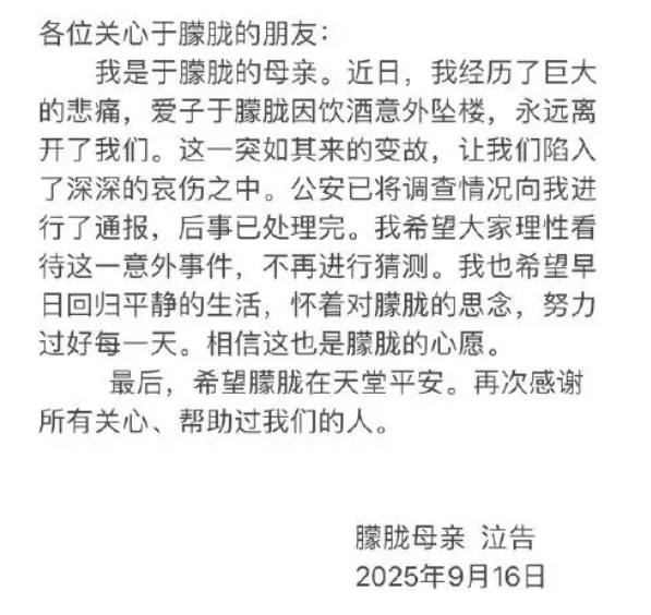 于朦胧母亲16日通过“于朦胧工作室”官方微博发文称,其子系饮酒意外坠楼。“我希望大家理性看待这一意外事件,不再进行猜测。”