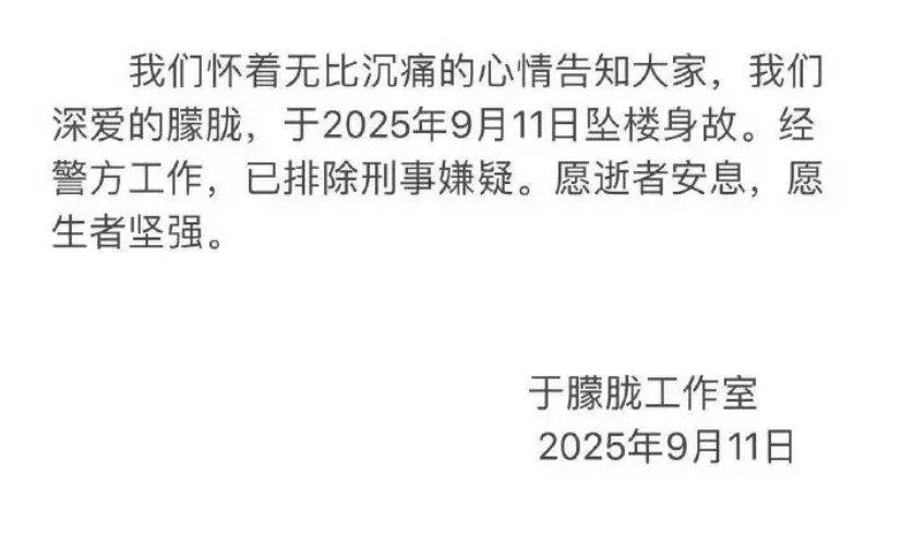 此前,于朦胧工作室9月11日发文称,于朦胧坠楼身故。已排除刑事嫌疑。