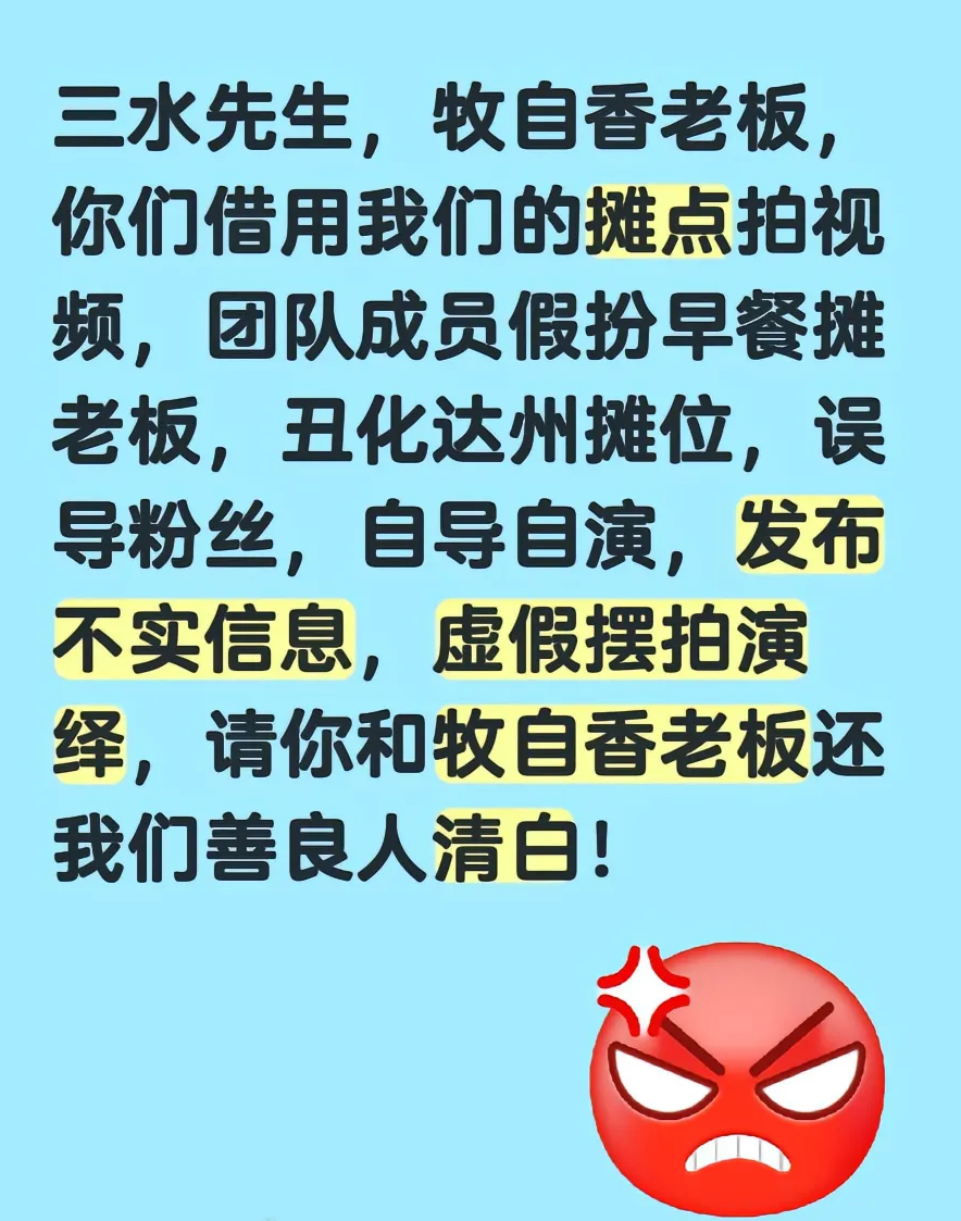 近日,一条未标注“剧情演绎”的14分钟视频,让四川达州一家早餐摊,摊主唐女士情绪崩溃,体重骤减。而制造这一事件的70万粉丝博主“三水居士”被质疑删除视频后跑路,至今未对此事公开回应。