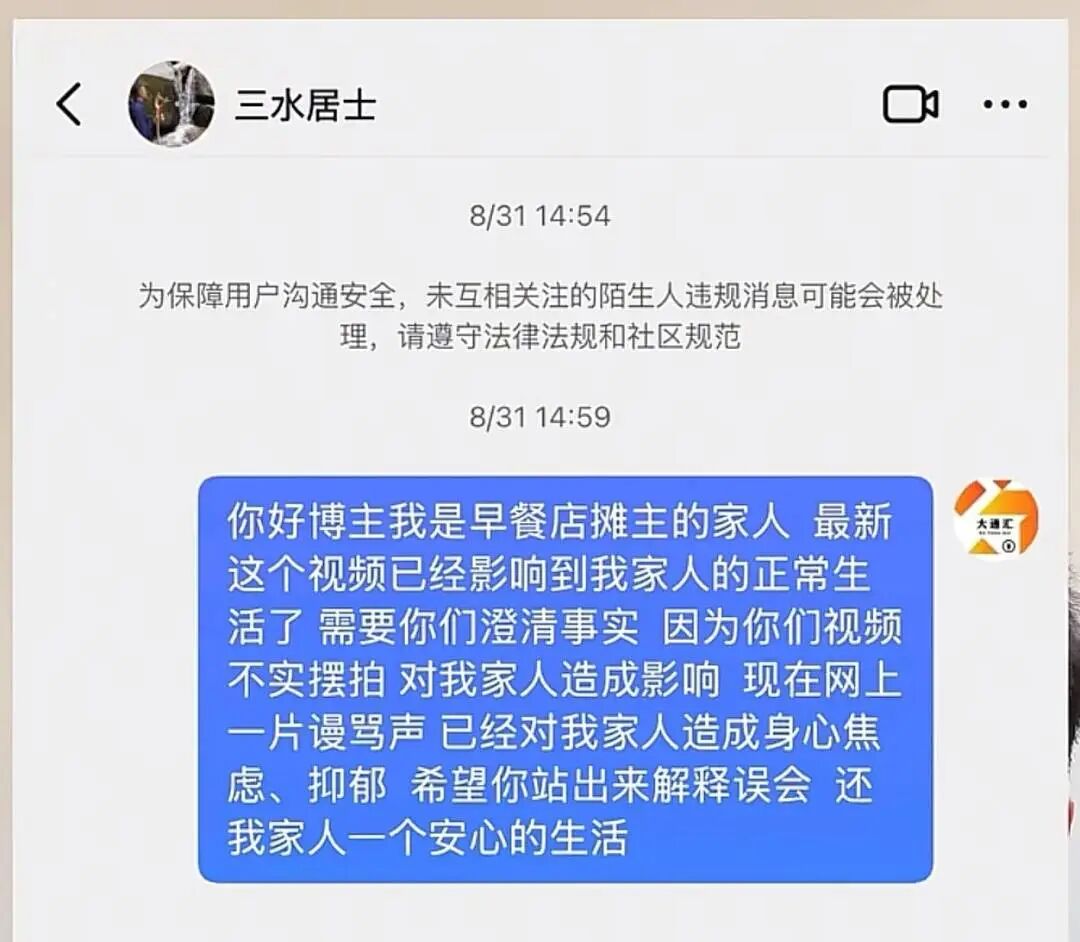 直到8月31日,唐女士及家人才知道,自家的早餐摊位被“三水先生”发布的摆拍视频抹黑,视频中的“摊主”并不是唐女士本人,而是由“丹丹”扮演。