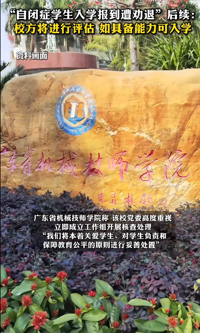 9月9日,“自闭症学生报到当天遭劝退”一事的报道引发社会广泛关注。当晚,广东省机械技师学院在其公众号发布情况说明称,将协商家长意见后,邀请专业机构对学生进行专业评估。如果评估认定学生具备入读学校相关专业的学习和生活能力,学校将尽快办理入学手续。