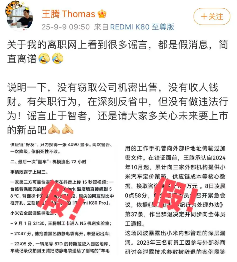 9月9日上午,@王腾Thomas在社交平台发文称,关于他的离职网上看到很多谣言,都是假消息,简直离谱。