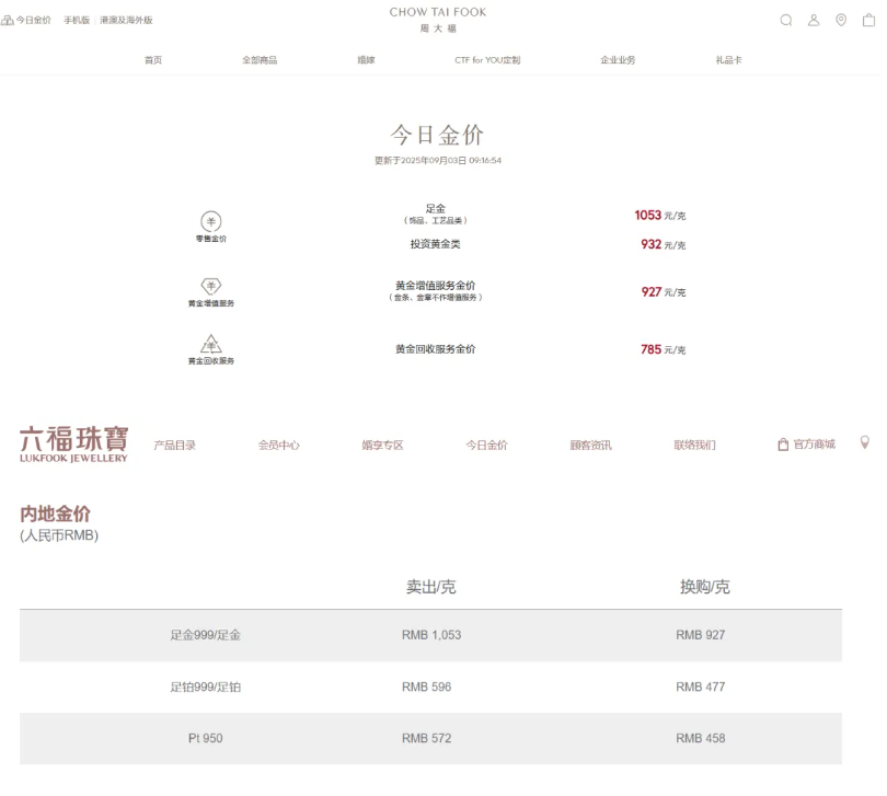受投资者预期美联储本月将降息以及外国央行持续强劲的需求推动,纽约黄金期货价格周二一度突破3600美元,创历史新高。黄金现货价格盘中也飙升至每盎司3540美元以上的历史高点。国内多家黄金珠宝品牌公布的境内足金首饰价格较昨日继续上涨。根据各大品牌9月3日最新公开数据,周大福、六福珠宝、潮宏基等品牌足金首饰价格报1053元/克,周生生报1056元/克。