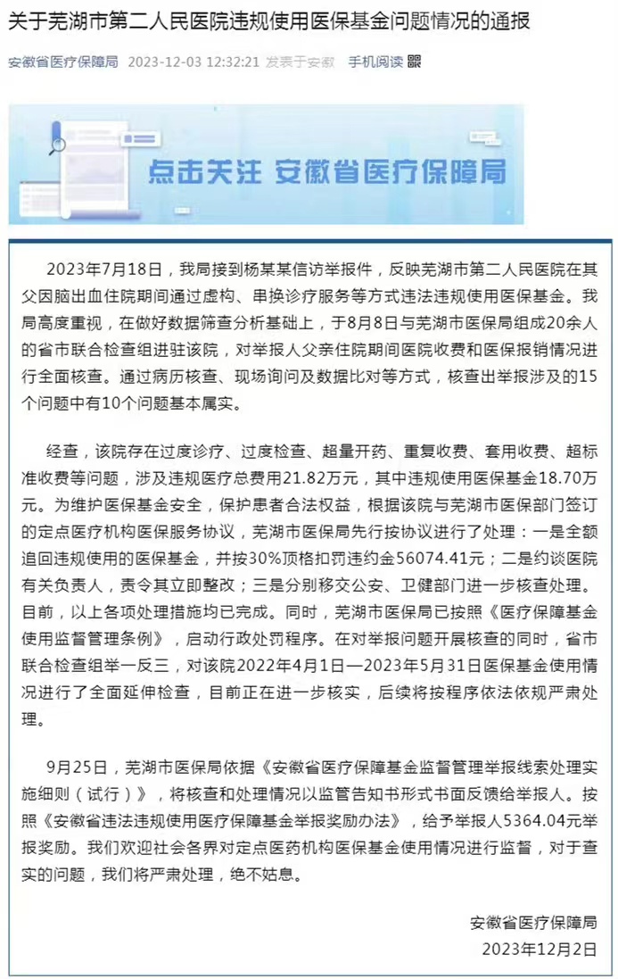 近日,一篇题为《名校博士自述:我是怎样查出医院多收我爸10万医疗费的》的报道在朋友圈刷屏。12月3日,安徽省医疗保障局通报称,涉事的芜湖市第二人民医院存在过度诊疗、过度检查、超量开药、重复收费、套用收费、超标准收费等问题,涉及违规医疗总费用21.82万元,其中违规使用医保基金18.70万元。